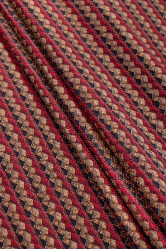 100% Jacquardi siid musta, punase ja kuldse värviga, tiheda ja peene mustriga, mis on paigutatud triipudesse. Kangas, millel on tihe kudumine, õrn sära ja jäigem struktuur. Ideaalne salli, lipsu, pluusi või meeste vesti jaoks. See võib olla ka dekoratiivne kangas.