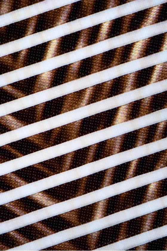 Itaalia organza kangas vahelduvate triipudega - läbipaistev ja läbipaistmatu, 0,5 cm lai. Siksakiline motiiv pruuni-beeži värviga. Läbipaistev vöö on kootud looduslikust siidist, läbipaistmatu aga polüestrist.