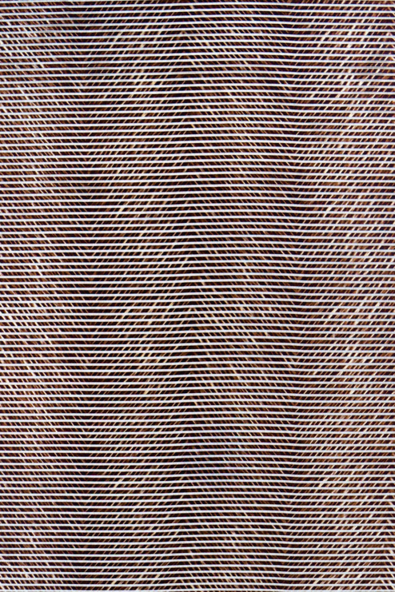 Itaalia organza kangas vahelduvate triipudega - läbipaistev ja läbipaistmatu, 0,5 cm lai. Siksakiline motiiv pruuni-beeži värviga. Läbipaistev vöö on kootud looduslikust siidist, läbipaistmatu aga polüestrist. Õhuke, jäik kangas - ideaalne seeliku, kleidi, pluusi õmblemiseks.