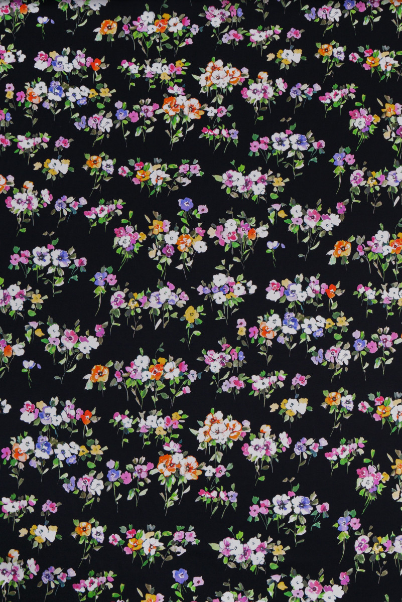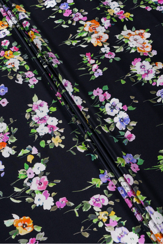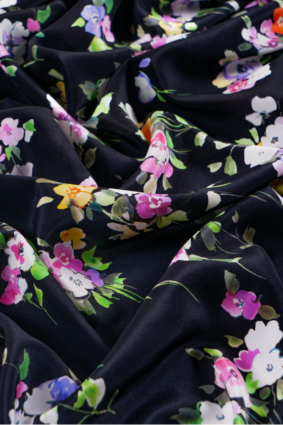 Itaalia 100% siidist krepp mustas värviliste lillede motiiviga. Siidist krepp on õrn, õhuke, poolmatt kangas. Seda saab kasutada õhuliste kleitide, õrnade pluuside, sallide, sallide väljameelitamiseks.