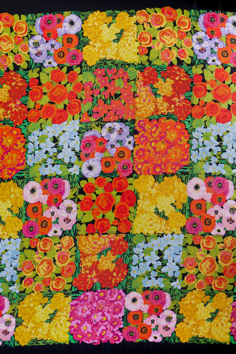 Itaalia 100% siidist twill kangas lillemotiividega mustal taustal, motiivid on paigutatud 20 cm laiuste ruutude kujul. Silk twill on kangas, millel on twill kudum, pehme, väga vastupidav, õrnalt jäik. Ideaalne särgi, kleidi, seeliku või salli/salli õmblemiseks.
