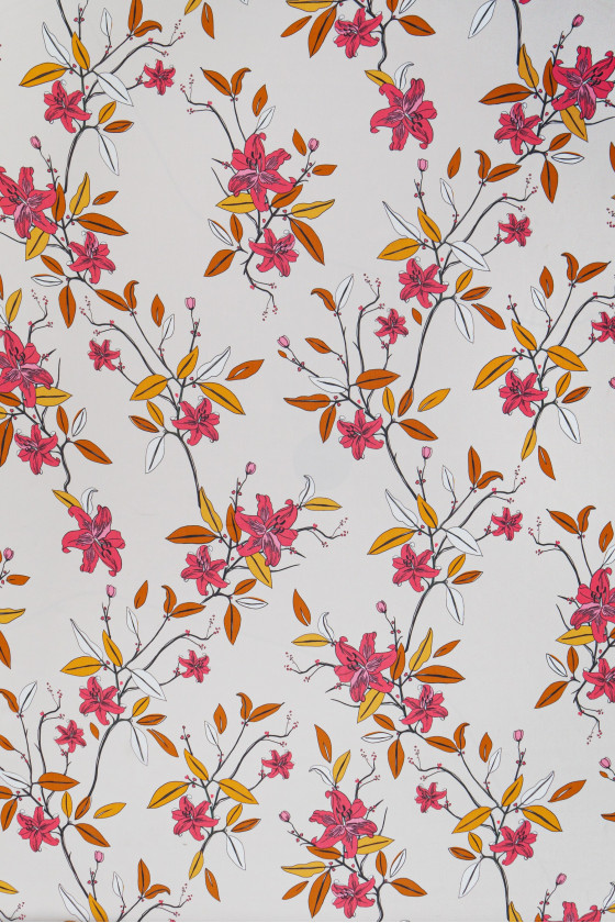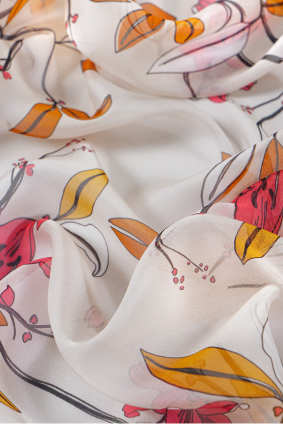 Itaalia musliin 100% siid helebeežis, lillemotiiviga vaarikas ja erkoranžis. Looduslikust siidist valmistatud musliin on väga õrn, õhuline ja läbipaistev kangas. Ideaalne õhuliste kleitide ja pluuside jaoks. Mitteelastne kangas.