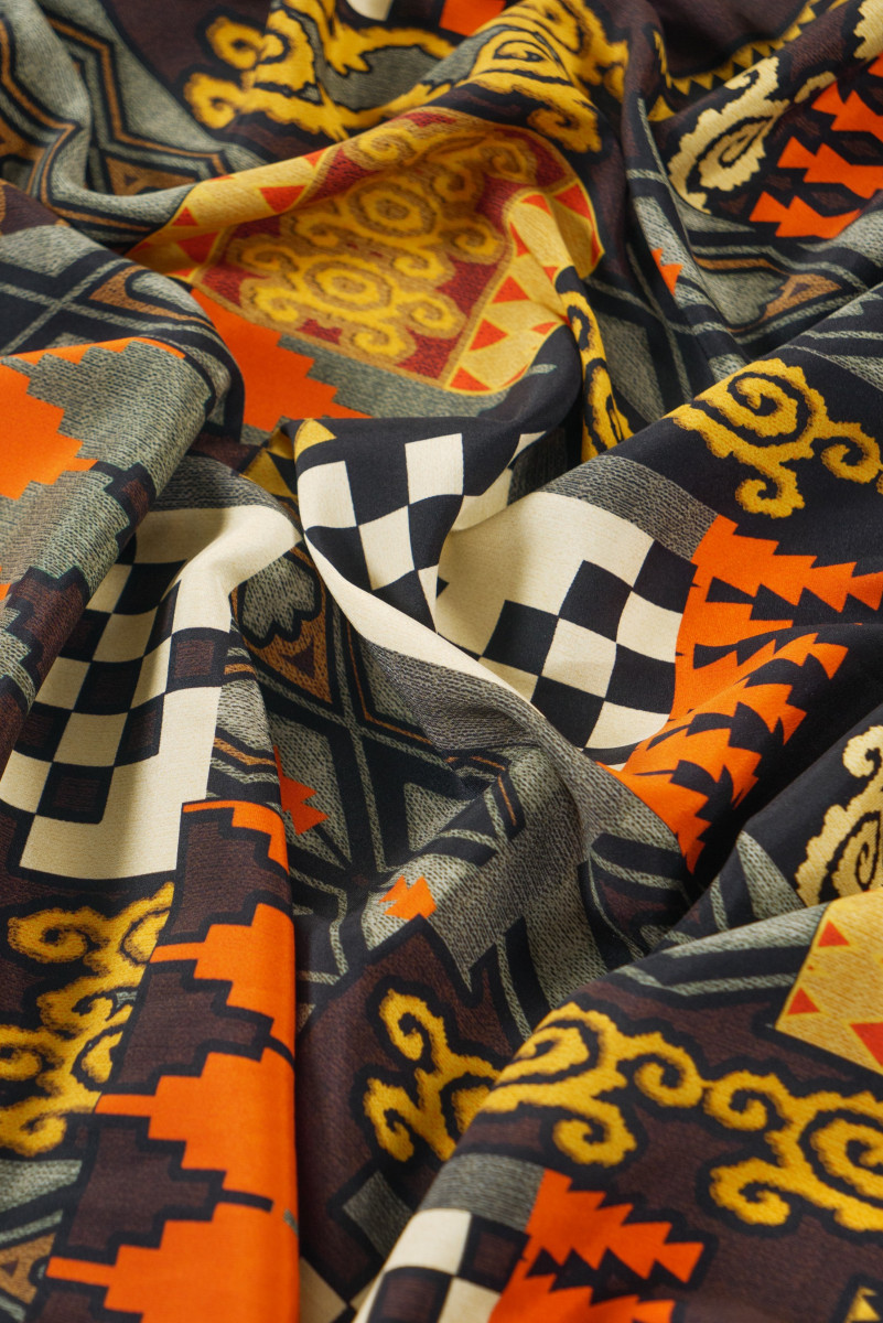 Itaalia siidist satiin etniliste motiividega järgmistes värvides: pruun, must, punane, beež. Stretch, pehme, voolav kangas - trükkimine toimub kanga mattpoolsel küljel. Siidsatiin on õrn kangas, sametine. Seda saab kasutada õhuliste kleitide, õrnade pluuside, sallide, sallide väljameelitamiseks.