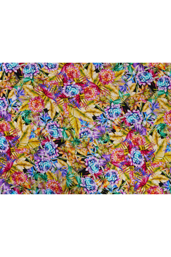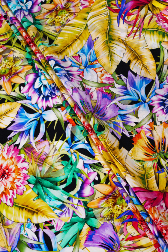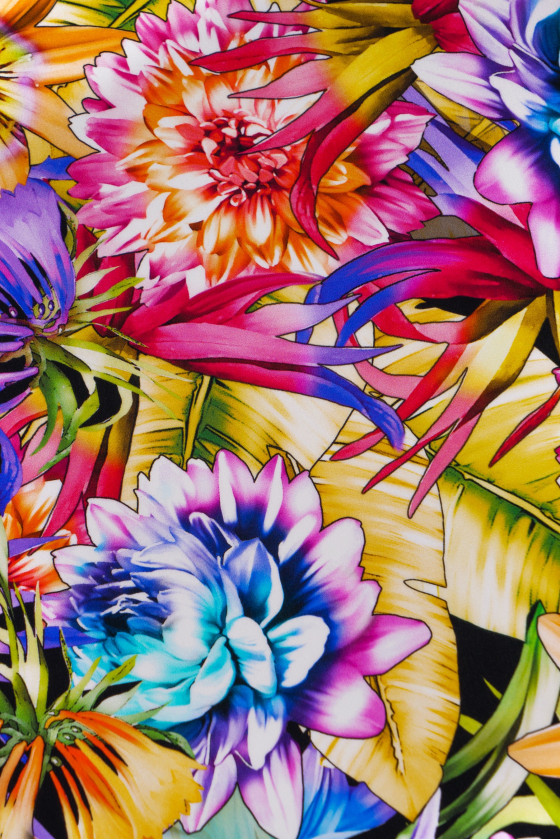 Itaalia krepp 100% siid värviliste lillede ja lehtedega. Siidkrepp on õrn, õhuke, poolmatt kangas.