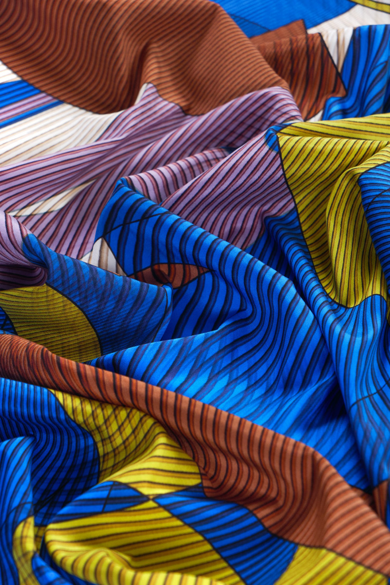 Itaalia siidist krepp koos elastaani seguga, millel on suured geomeetrilised mustrid rukkilille, sinepi ja pruuni kujul. Siidist krepp on õrn, õhuke, poolmatt kangas.