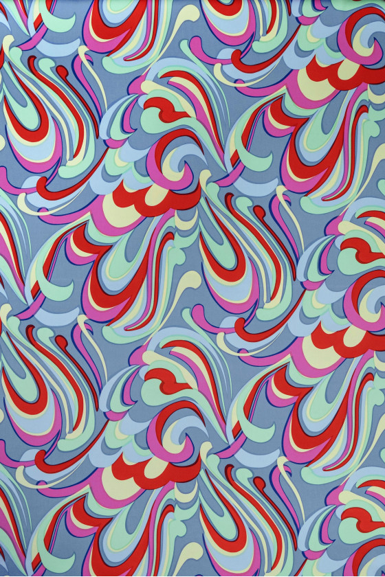 Itaalia krepp 100% siid värviliste, väljamõeldud mustritega hallikassinisel taustal. Tuntud moeloojale iseloomulik motiiv.