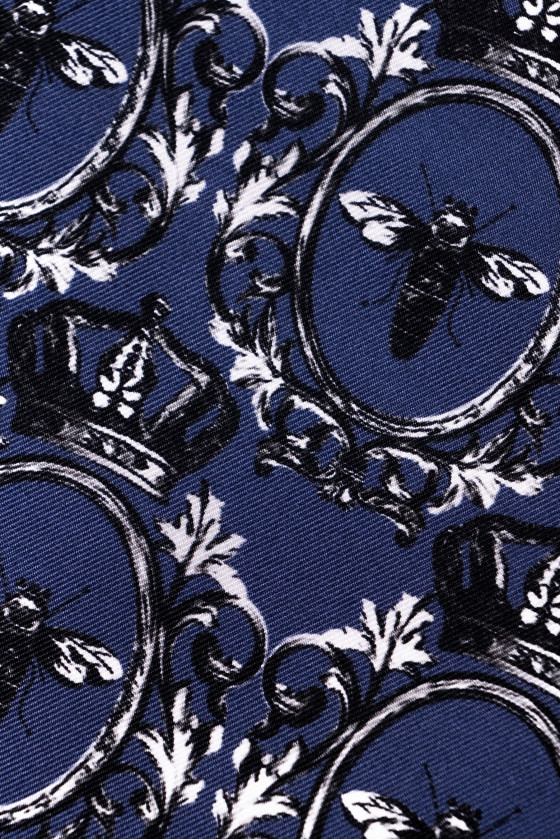 Itaalia 100% siidist twill kangas tumesinine, vibu twill motiiv kroonis valge ja must (motiiv on 8 cm suurune). Silk twill on kangas, millel on twill kudum, pehme, väga vastupidav, õrnalt jäik.