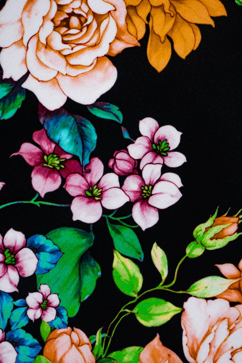 Itaalia 100% siidist satiin mustas keskmise suurusega lillemotiiviga. Siidsatiin on tihe ja kerge kangas, millel on tasane pind, mis on valmistatud satiinist kudumisest. Täiendav eelis on selle siledus ja vastupidavus, samuti asjaolu, et see sobib väga hästi, ei näita läbi ja on meeldiv puudutada. Ühelt poolt on see matt ja teiselt poolt on see üllalt läikiv. Seda saab kasutada õhuliste kleitide, õrnade pluuside, seelikute, sallide, sallide väljameelitamiseks.