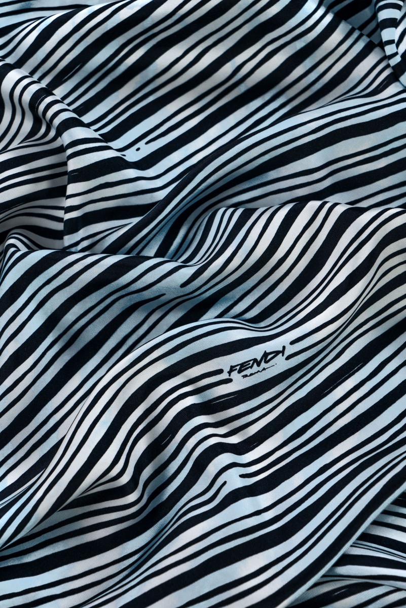 Itaalia 100% siidist twill kangas mustade, põikribadega varjutatud taustal sinine ja kreemjas. Kangas on allkirjastatud tuntud moemaja nimega.