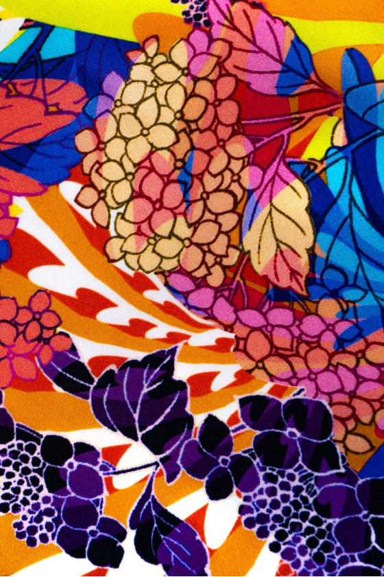 Itaalia siid satiin, elastne lillede ja lehtede motiiviga lilla, oranži, rukkilille ja roosa toonides. Siidsatiin on tihe ja kerge kangas, millel on tasane pind, mis on valmistatud satiinist kudumisest. Täiendav eelis on selle siledus ja vastupidavus, samuti asjaolu, et see sobib väga hästi, ei näita läbi ja on meeldiv puudutada. Ühelt poolt on see matt ja teiselt poolt on see üllalt läikiv. Seda saab kasutada õhuliste kleitide, õrnade pluuside, seelikute, sallide, sallide väljameelitamiseks.
