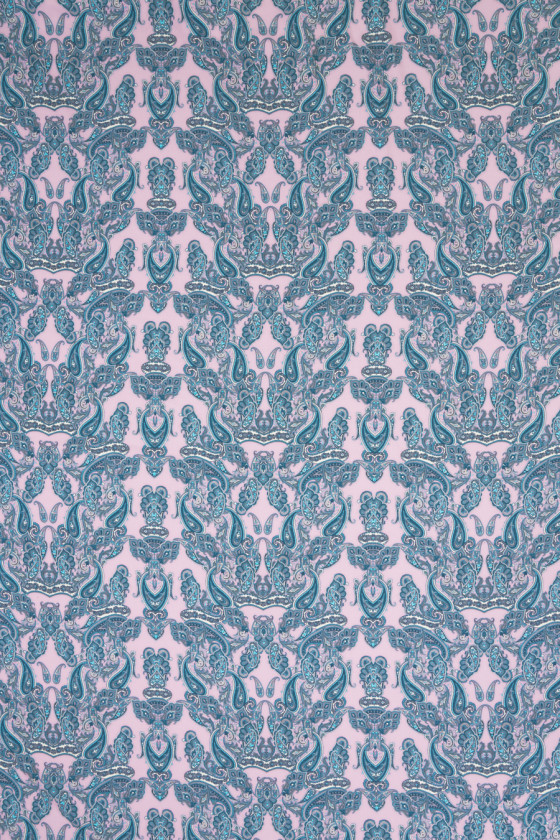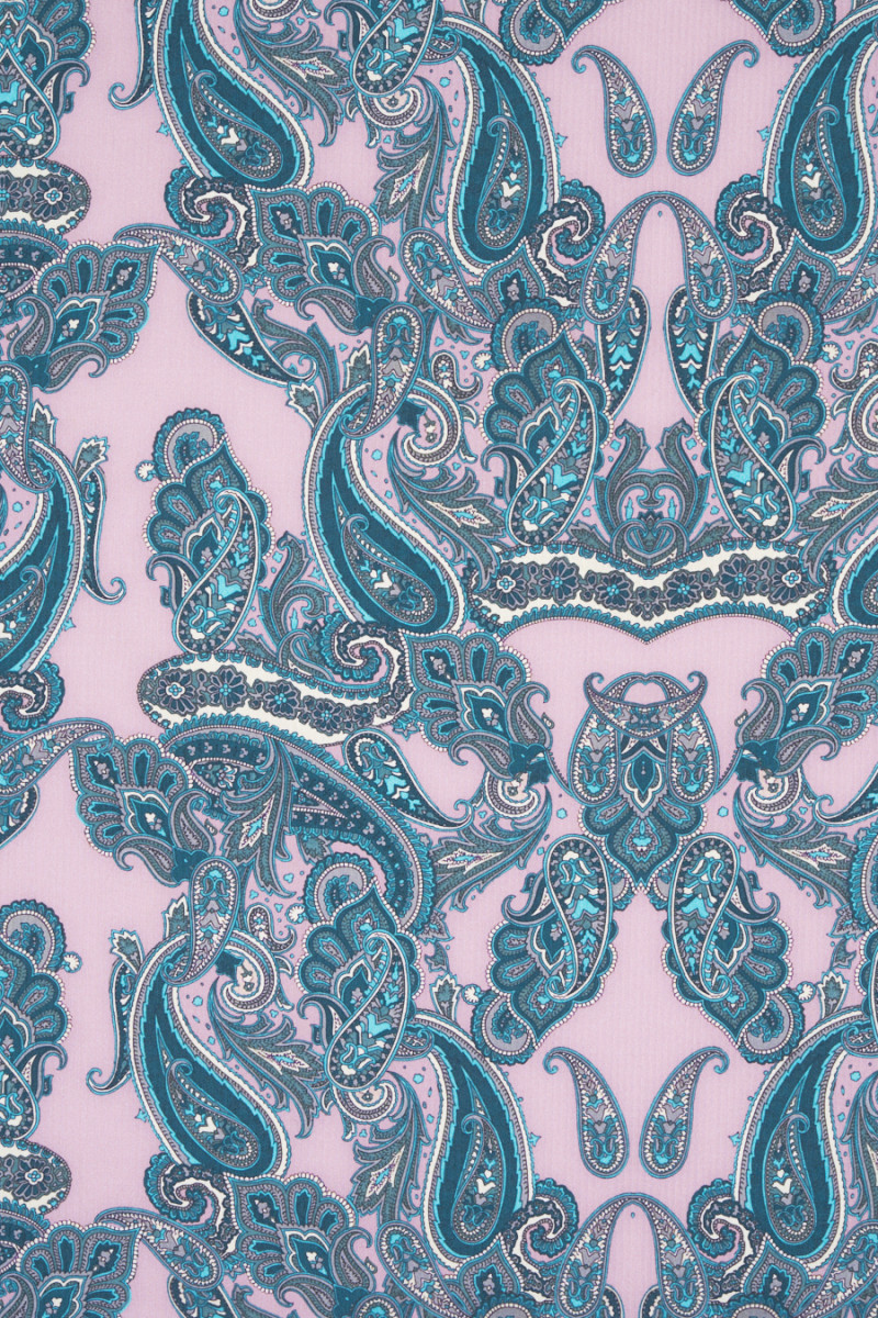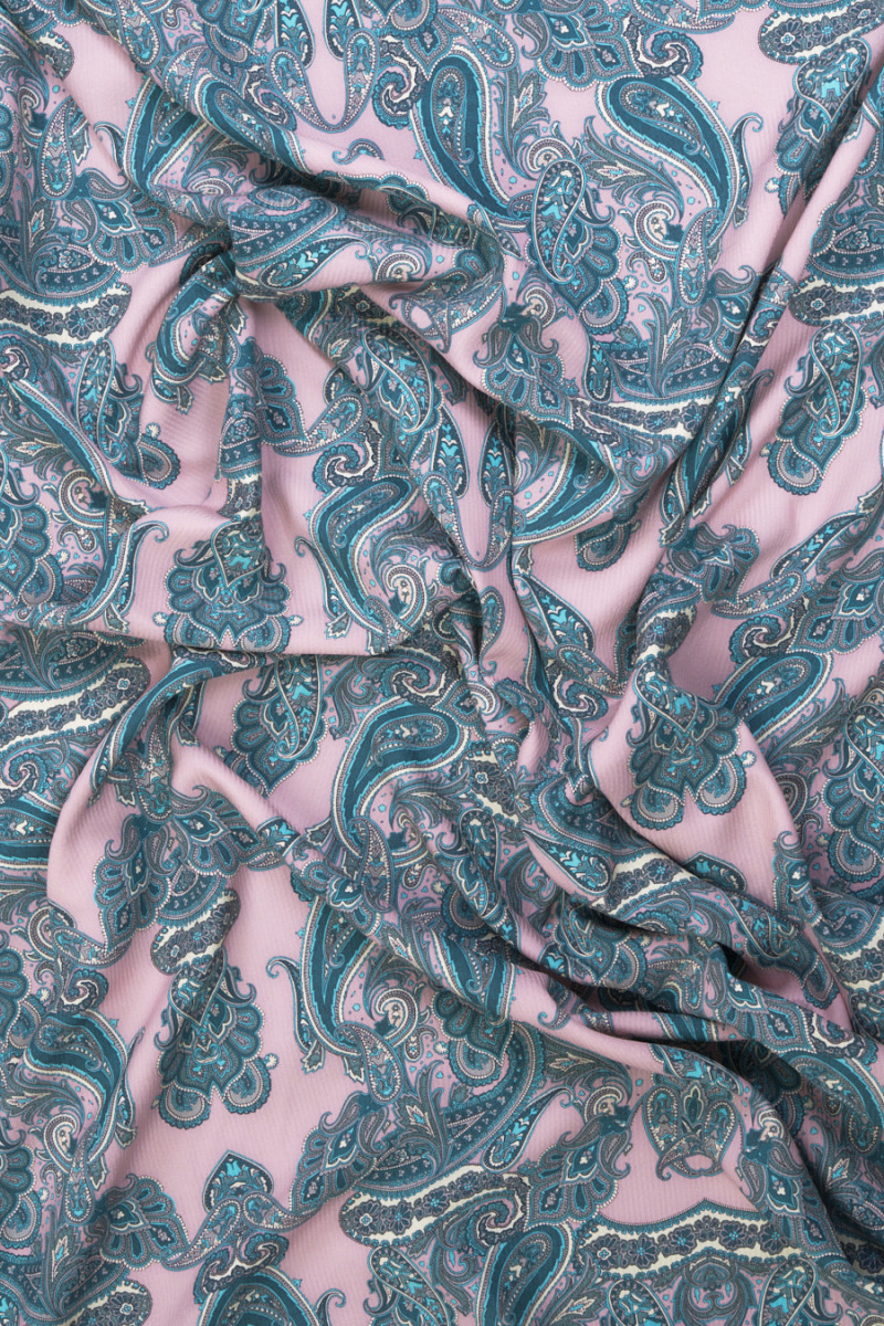 Itaalia 100% siidkangas, millel on õrn grosgrain, mis on kootud määrdunud roosas väga populaarse, idamaise paisley motiiviga mererohelise ja türkiissinise toonides. Ideaalne ettepanek inimestele, kellele meeldivad originaalsetes värvides moes mustrid.