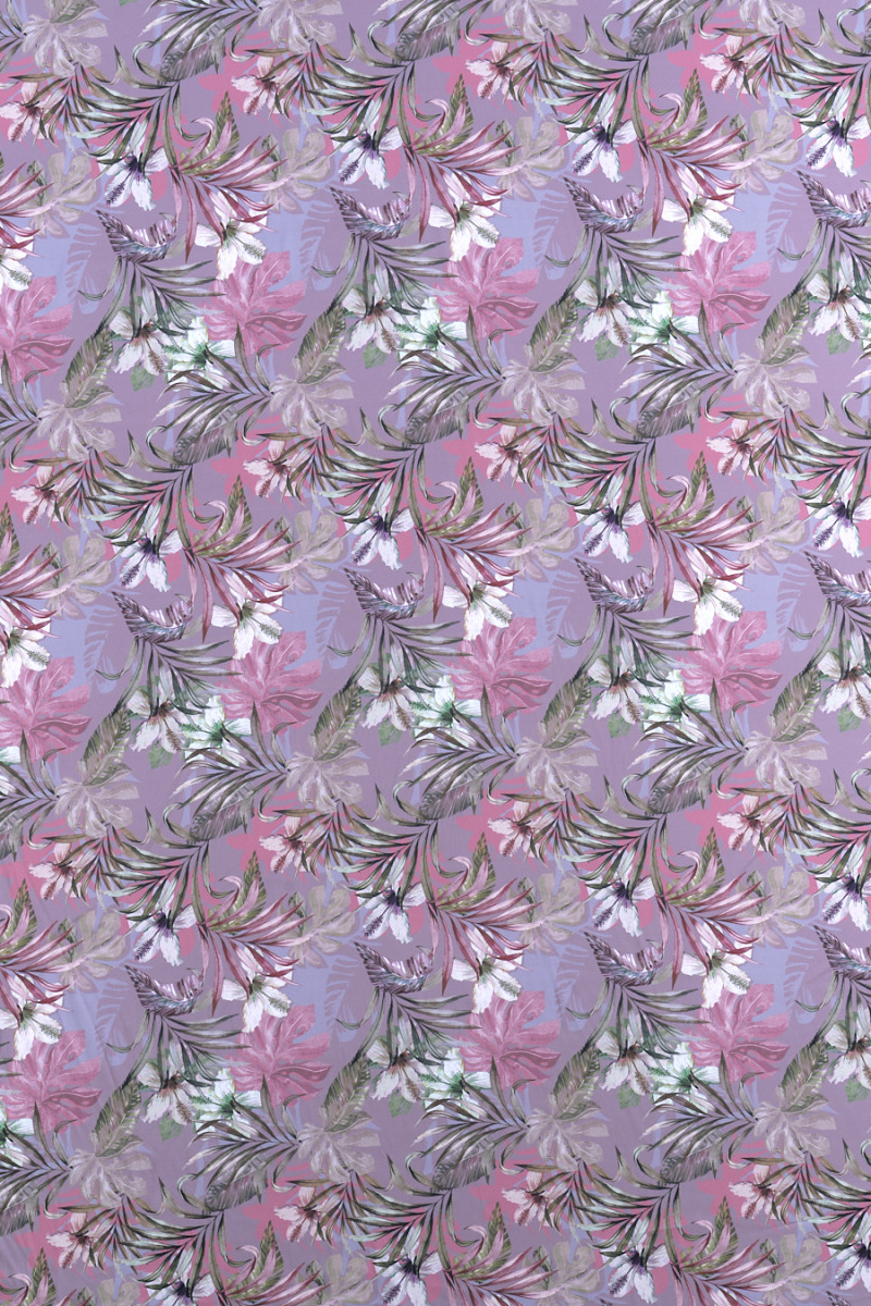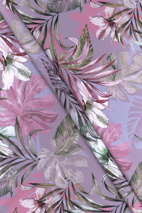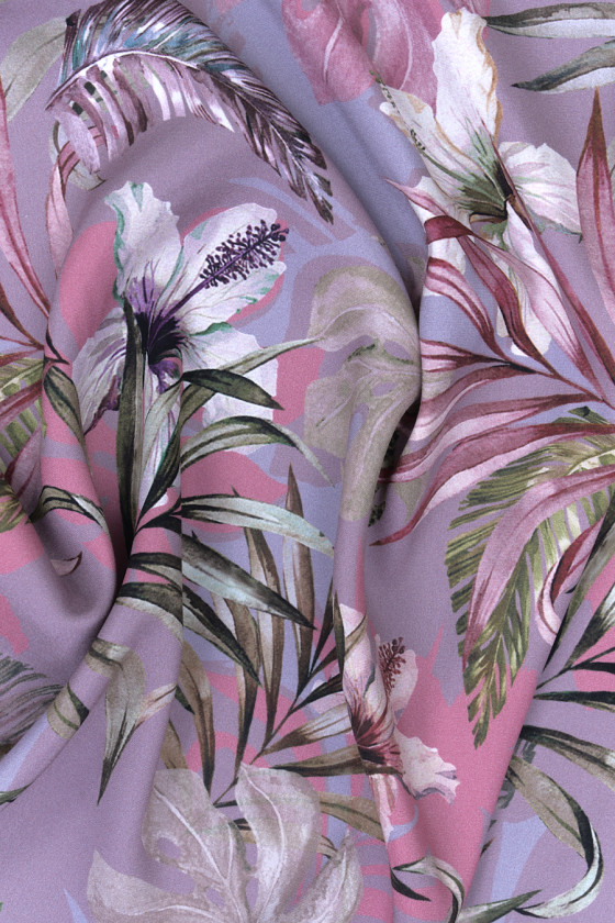 Itaalia siidist satiin, elastne ja kaunis lillemotiiv. Määrdunud roosa ja vaigistatud lilla taustal trükiti roheliste palmilehtedega ümbritsetud kreemikate liiliaõite muster - trükk tehti mattpoolsele küljele. Tervikut hoitakse väga tagasihoidlikes värvides, nii et see kangas sobib suurepäraselt elegantseteks väljasõitudeks, nagu armulaud või pulmatseremoonia.