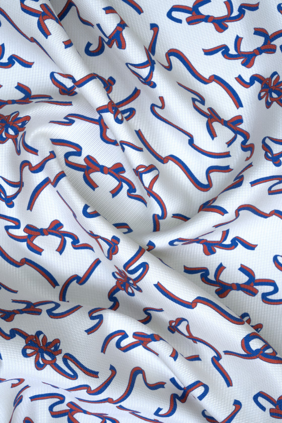Itaalia 100% siidkangas kreemikas ja lindimotiiviga. Kangas on veidi paksem, peene jacquardi struktuuriga ja siidriietele iseloomuliku õrna läikega. Muster on tihe, ebakorrapärase kujuga sinine ja punane, see on tuntud Itaalia moemaja kollektsioonis. See on fantastiline ettepanek kerge pluusi või kleidi õmblemiseks. Kui teile meeldivad üllas kangad ja moes värvides kaubamärgiga mustrid, on see kangas just teie jaoks.