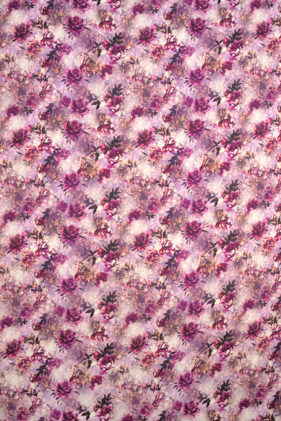 Itaalia siidist satiin, millele on lisatud elastaani, mille trükk on tehtud mattküljele. Ilus, tihe roosiõite motiiv lillades värvides mustade ja kreemiliste aktsentidega. Kogu on tehtud varjutatud, lilla-kreemilisel taustal, millel on väikesed täpid, mis meenutavad lund. Fantastiline ettepanek inimestele, kellele meeldivad rahulikes värvides lillemotiivid. See kangas sobib suurepäraselt kleidi, seeliku või ilusa särgi õmblemiseks.