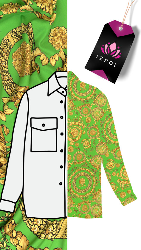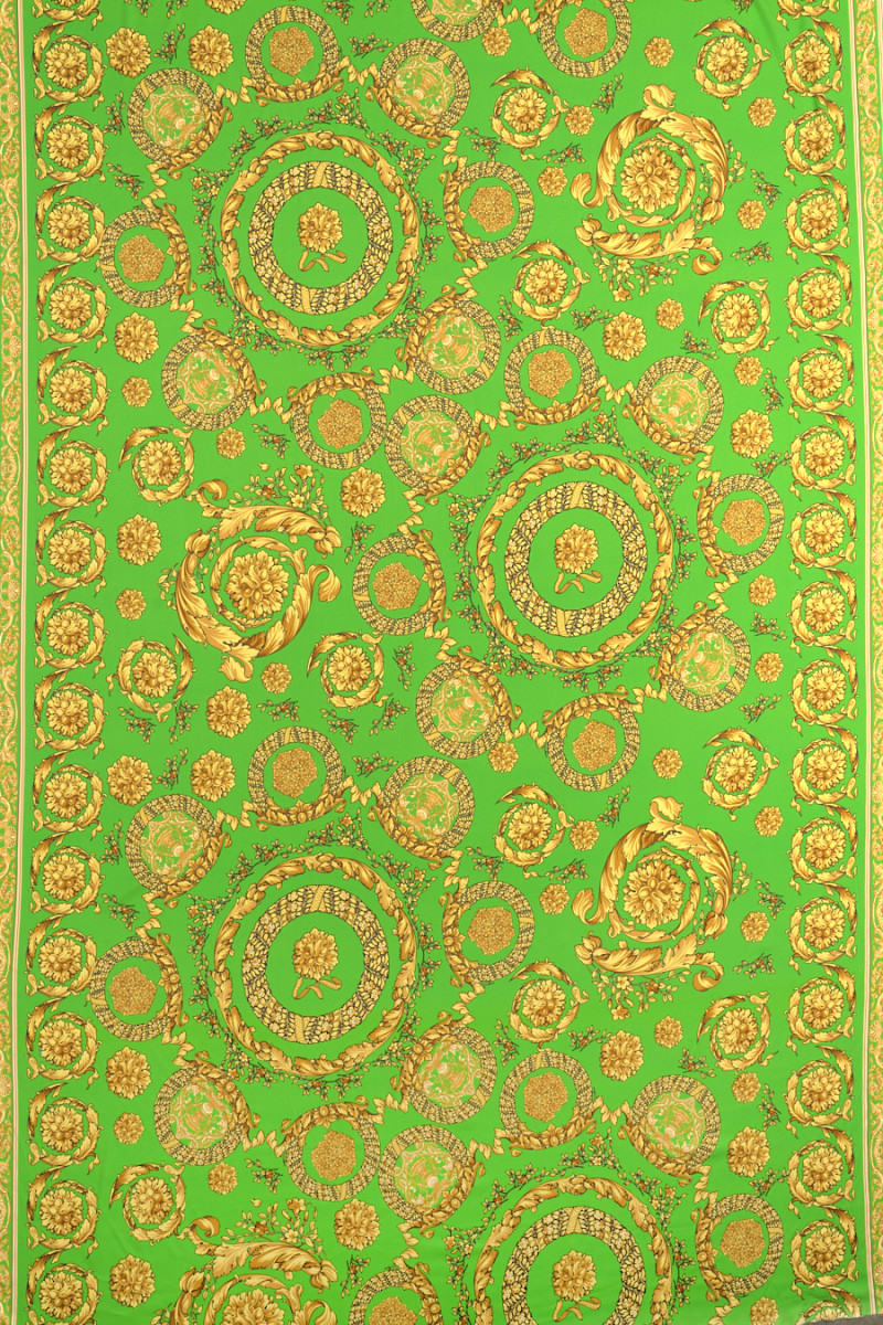 Itaalia siidist satiin, millele on lisatud elastaani, mille trükk on tehtud mattküljele. Ilus, tihe motiiv kuldsetest kaunistustest, mis on paigutatud ümmargustesse mustritesse. Mõlema serva ääres on kangas viimistletud 5 cm laiuste dekoratiivsete piiridega ja ümmarguste motiividega, mis moodustavad vertikaalsed triibud. Kogu on trükitud ilusale rohelisele taustale. See on väga mitmekülgne kangas, seda saab õmmelda nii vertikaalselt kui ka horisontaalselt. Elastaani lisamine muudab kandmise mugavamaks ja kortsub vähem. See sobib suurepäraselt originaalse särgi, kleidi või seeliku õmblemiseks.