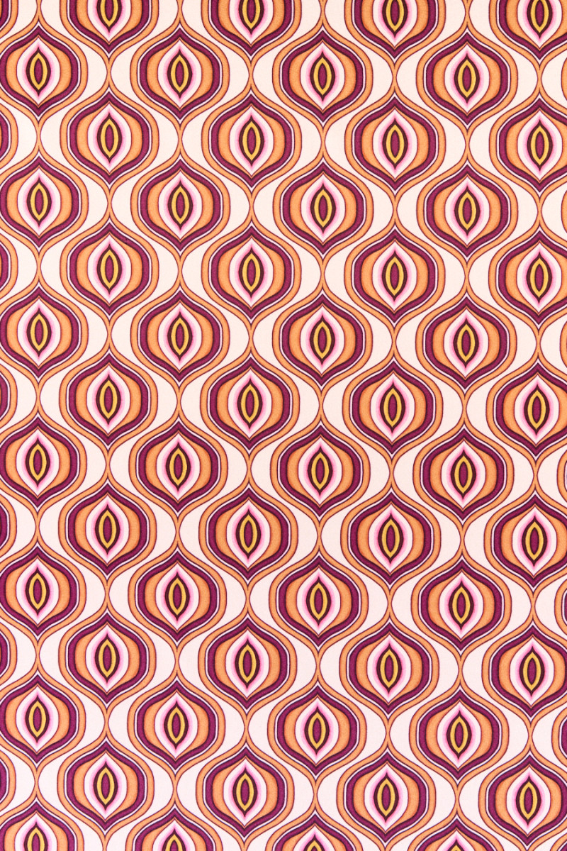 Itaalia siidist satiin, millele on lisatud elastaani, millel on beežil taustal tavaline paabulinnu silmade muster. Tihedalt paigutatud motiivid suurusega 5 cm * 5 cm punastes, burgundilistes ja roosades värvides. Siidsatiin on tihe ja kerge tasase pinnaga kangas, elastaani lisamine muudab selle kandmise mugavamaks ja kortsub vähem. See sobib suurepäraselt ilusa särgi, seeliku ja lõdvemate pükste õmblemiseks.