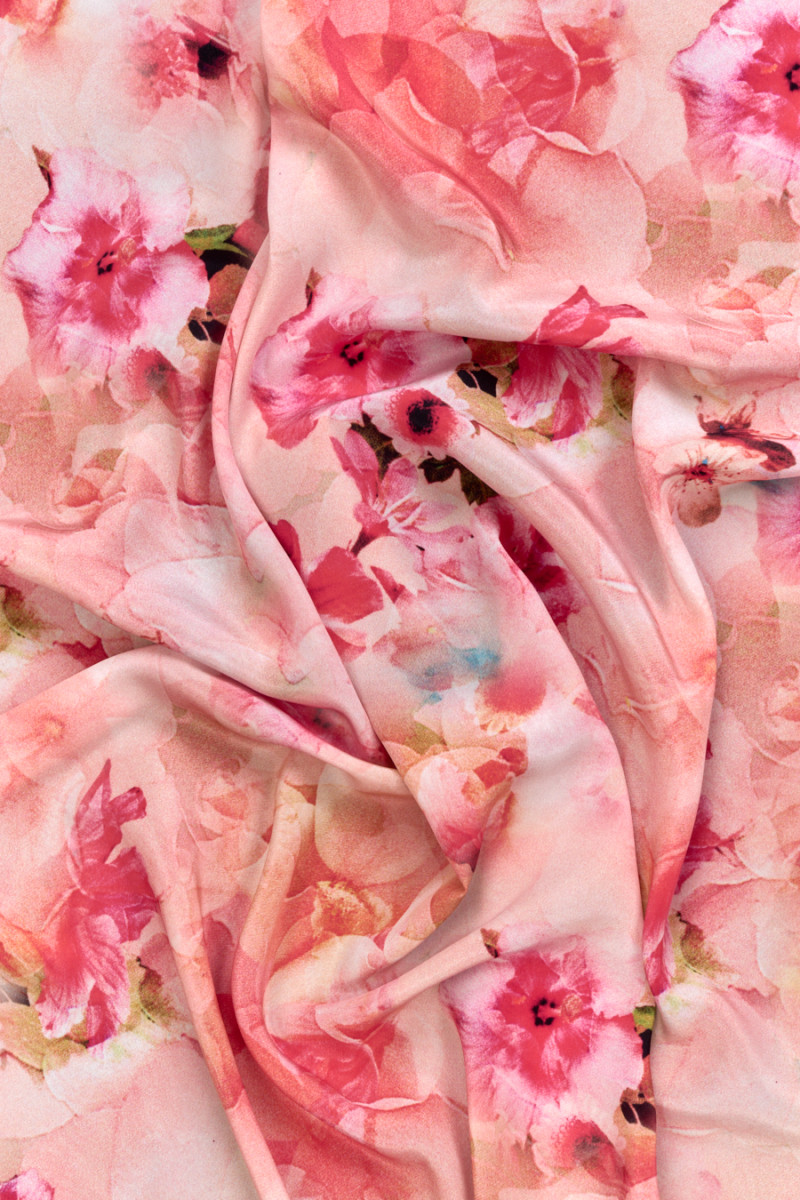 Itaalia 100% siidist krepp suurte fuzzy lillede motiiviga roosas, korallis ja oranžis. Kangas on õrn, õhuke, kuid läbipaistmatu, poolmatt ja kerge. Romantiline ettepanek, mis sobib hästi suvekleitide, seelikute, pluusidega.