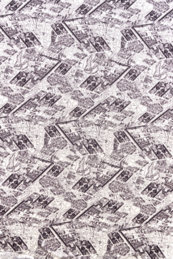 Itaalia siidkangas, mille linnaplaani motiiv on must valgel taustal. Tihe muster, mis kujutab hooneid, tänavaid, väljakuid nende nimedega. Jacquardi struktuuriga kangas - kitsad triibud tervikuna, elastne, matt, kergelt jäik, sarnaneb puuvillaga. Huvitav ettepanek, millest saate luua pluuse, särke, kleite ja seelikuid.