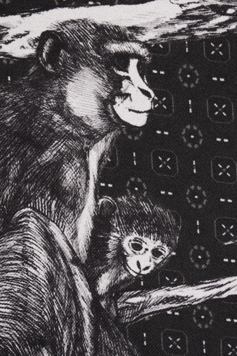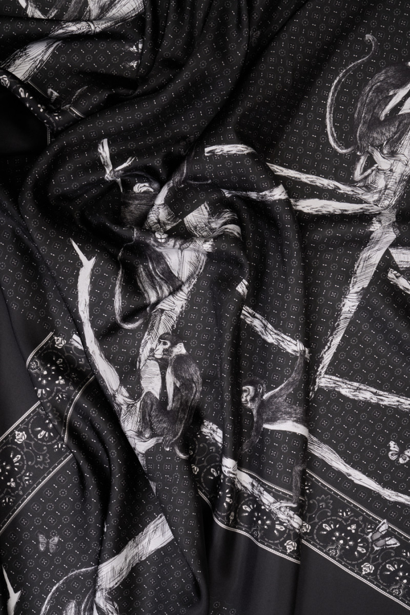 Itaalia 100% siidist twill kangas halli ahvimotiiviga grafiidi taustal, mis on täidetud pisikese mustriga. Kangas on 230 cm pikkuses kupongis ja koosneb lõigatavatest valmiselementidest. Materjal on õhuke, kuid läbipaistmatu, õrna twill kudumisega, elastne ja pärineb tuntud moemaja kollektsioonist. Fantastiline ettepanek loomakujunduse fännidele, kes otsivad originaalsust ja erakordsust.