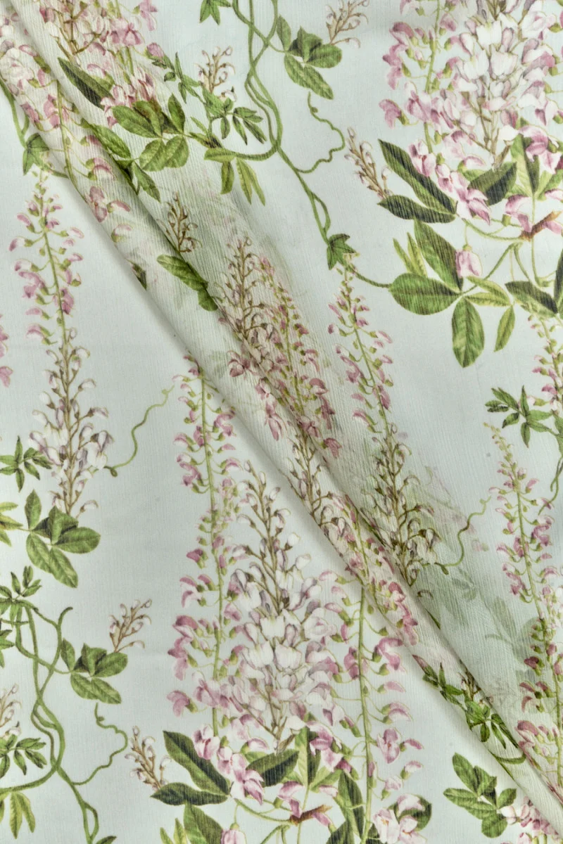 Itaalia šifoon 100% siid, kortsus väikeste lillede, varte ja lehtede motiiviga väga kergel akvamariini taustal. Õrn muster, mis on üsna tihedalt asetatud lillede ja roheliste lehtede ja varre roosa värvi. Kangas on läbipaistev, mitteelastne, matt ja õhuline. See sobib ideaalselt koristustega kleitide ja pluuside jaoks.