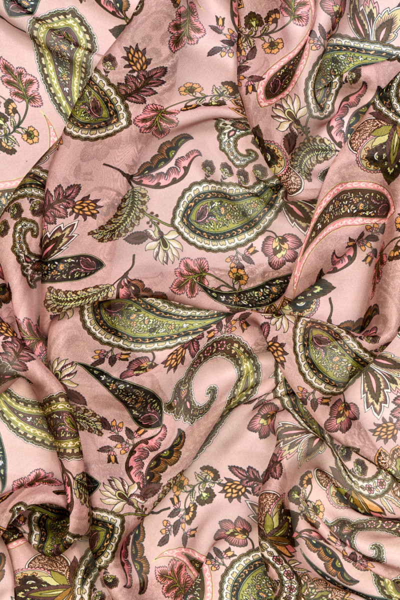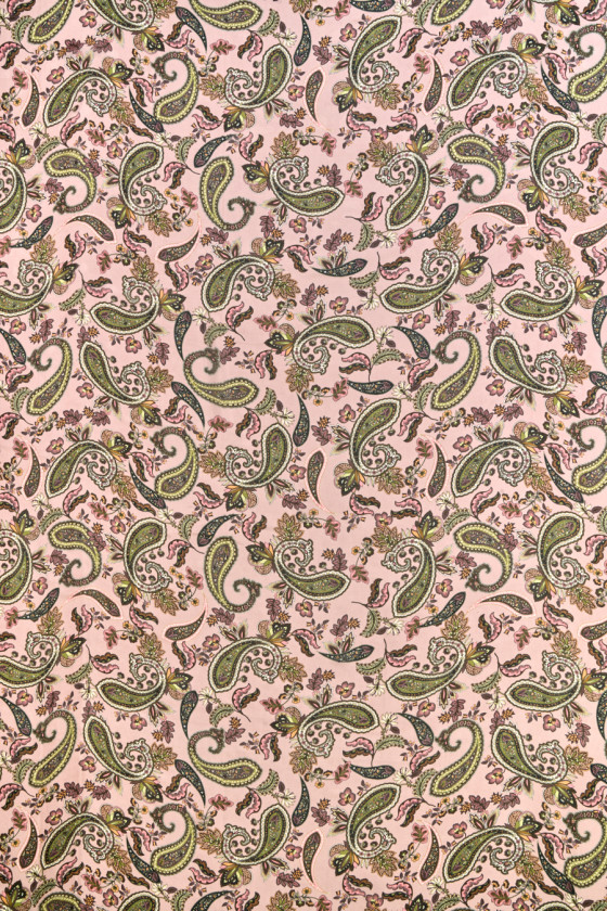 Itaalia kangas, mis on kootud looduslikust siidist ja viskoosist roheliste paisley motiividega, oranžid ja roosad lilleelemendid määrdunud, roosal taustal. Kangas on väga kerge, õhuline, läbipaistev, õrn ja mitteelastne. Suurepärane ettepanek kleitide, seelikute, pluuside ja rätikute jaoks.