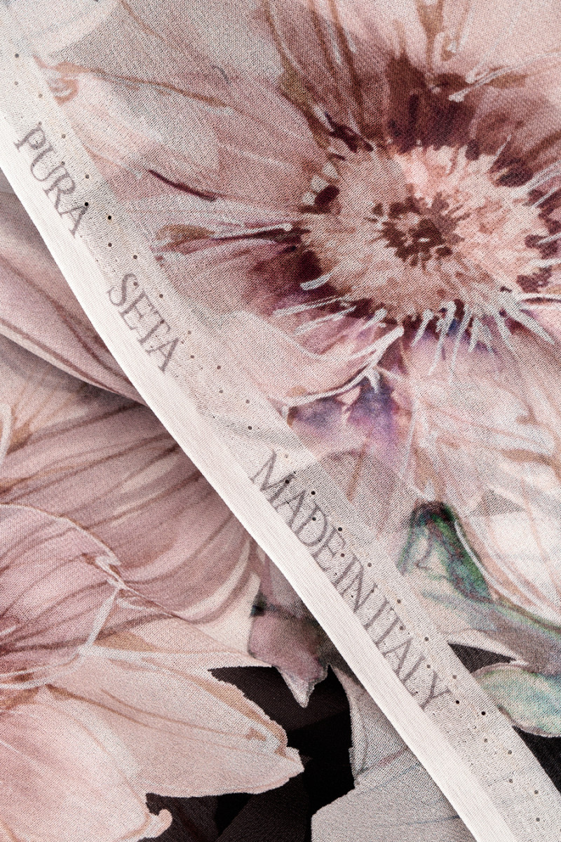 Itaalia šifoon 100% siid suurte lilledega pastelsetes toonides mustal taustal. Tihe, korduv muster, mis on tehtud roosade, siniste, roheliste heledates toonides, lilled suurusega 18cm * 19cm. Kangas on kerge, õhuline, kergelt läbipaistev ja pärineb tuntud moelooja kollektsioonist. Ilus ettepanek luua romantilises väljaandes kleit, pluus või seelik.