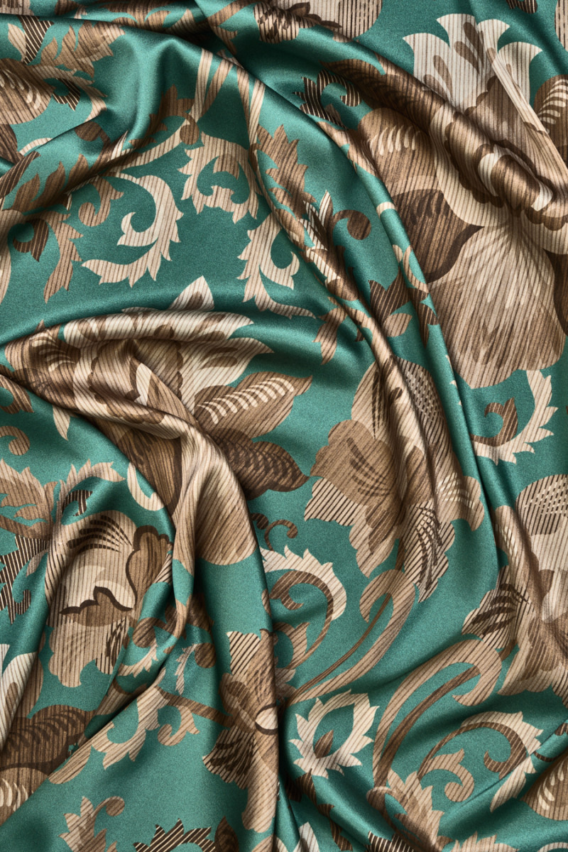 Itaalia siidist satiin, millele on lisatud idamaise motiiviga elastaan tolmusel rohelisel taustal. Tavaline, suur lilli meenutav muster on valmistatud beeži toonides, suurim lill on 27 cm pikk ja 38 cm lai. Kangas on voolav, pehme, elastne ja kaunilt läikiv, mis annab talle ainulaadse elegantsuse. Ilus ettepanek, mis sobib ideaalselt sügislõigeteks, mis sobib hästi õhuliste kleitide, seelikute, aga ka pluuside ja särkide õmblemiseks.