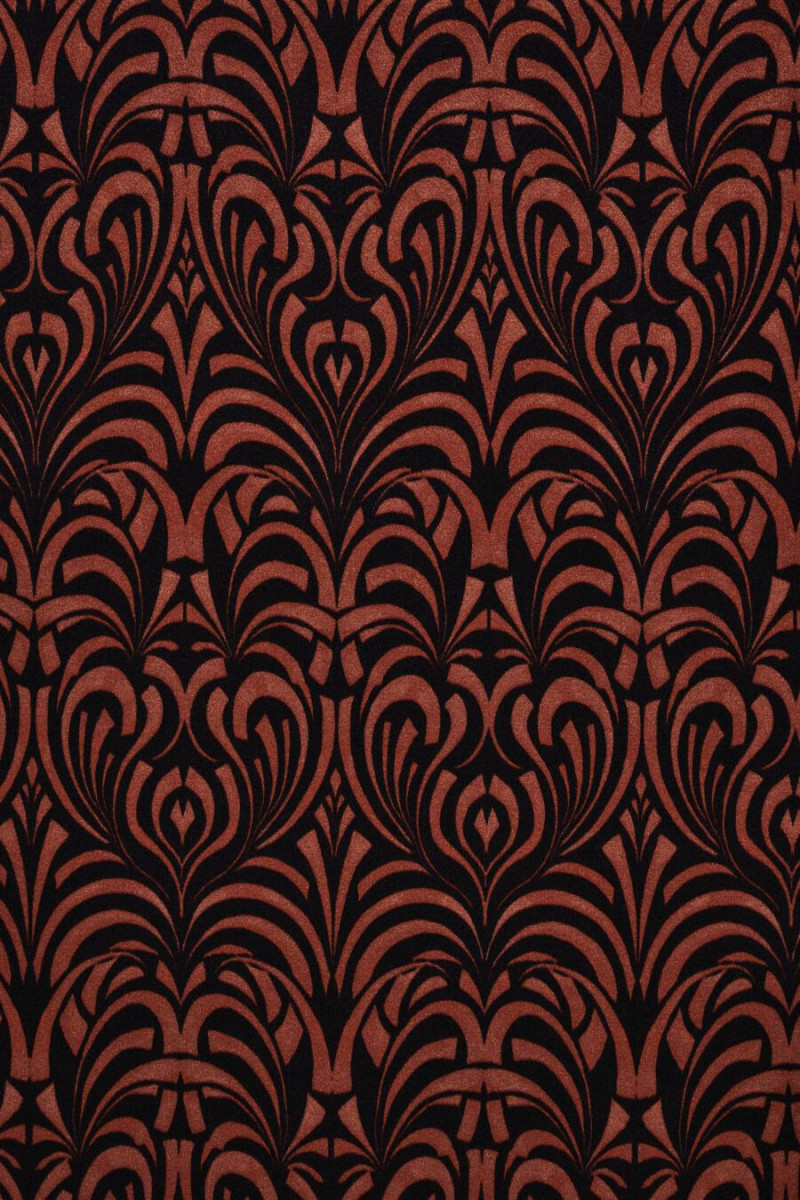 Itaalia siidist satiin, millele on lisatud idamaiste motiividega elastaani punakasoranžil tumedal tumesinisel taustal. Väga tihe ja korrapärane muster kaunites sügisvärvides, mis näeb väärikas välja. Kangas on voolav, pehme, elastne ja kaunilt läikiv, mis annab talle elegantsuse. Ainulaadne ettepanek, mis sobib hästi õhuliste kleitide, seelikute, samuti pluuside ja särkide õmblemiseks.