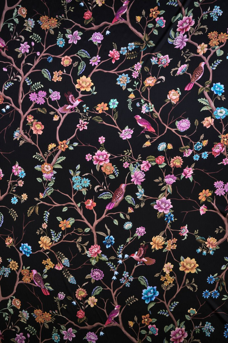 Itaalia siidist satiin, millele on lisatud elastaani, millel on üsna tihe pruunide okste motiiv, mis on kaunistatud värviliste lillede ja lindudega mustal taustal. Lilled ja linnud, mis on valmistatud roosa, lilla ja õrnama oranži energilistes toonides. Kangas on voolav, pehme, elastne ja kaunilt läikiv, mis annab talle ainulaadse elegantsuse. See sobib suurepäraselt õhuliste kleitide, seelikute, aga ka pluuside ja särkide jaoks.