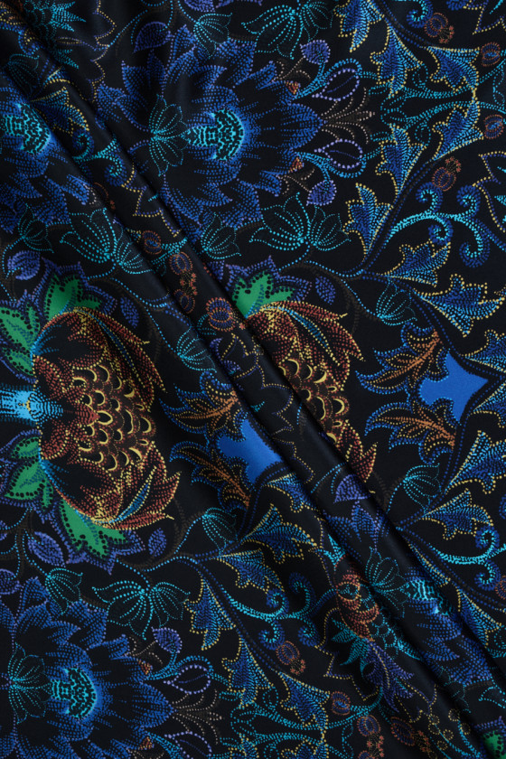 Itaalia satiin 100% siid idamaiste lillede motiiviga mustal taustal. Tihe muster, mis on valmistatud üsna heledates rukkilille, oranži, rohelise ja türkiissinise toonides väikeste punktide kujul, mis loovad huvitavat idamaist taimestikku. Kangas on voolav, pehme, mitteelastne ja kaunilt läikiv, mis annab sellele ainulaadse elegantsi ja pärineb tuntud moelooja kollektsioonist. Huvitav ettepanek, mis sobib hästi õhuliste kleitide, seelikute, samuti pluuside ja särkidega.