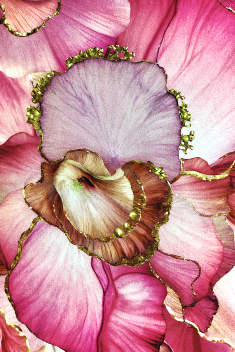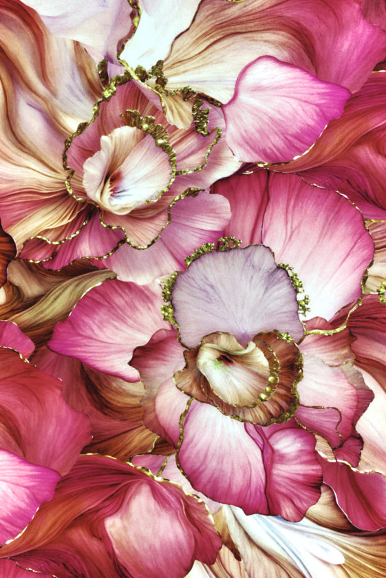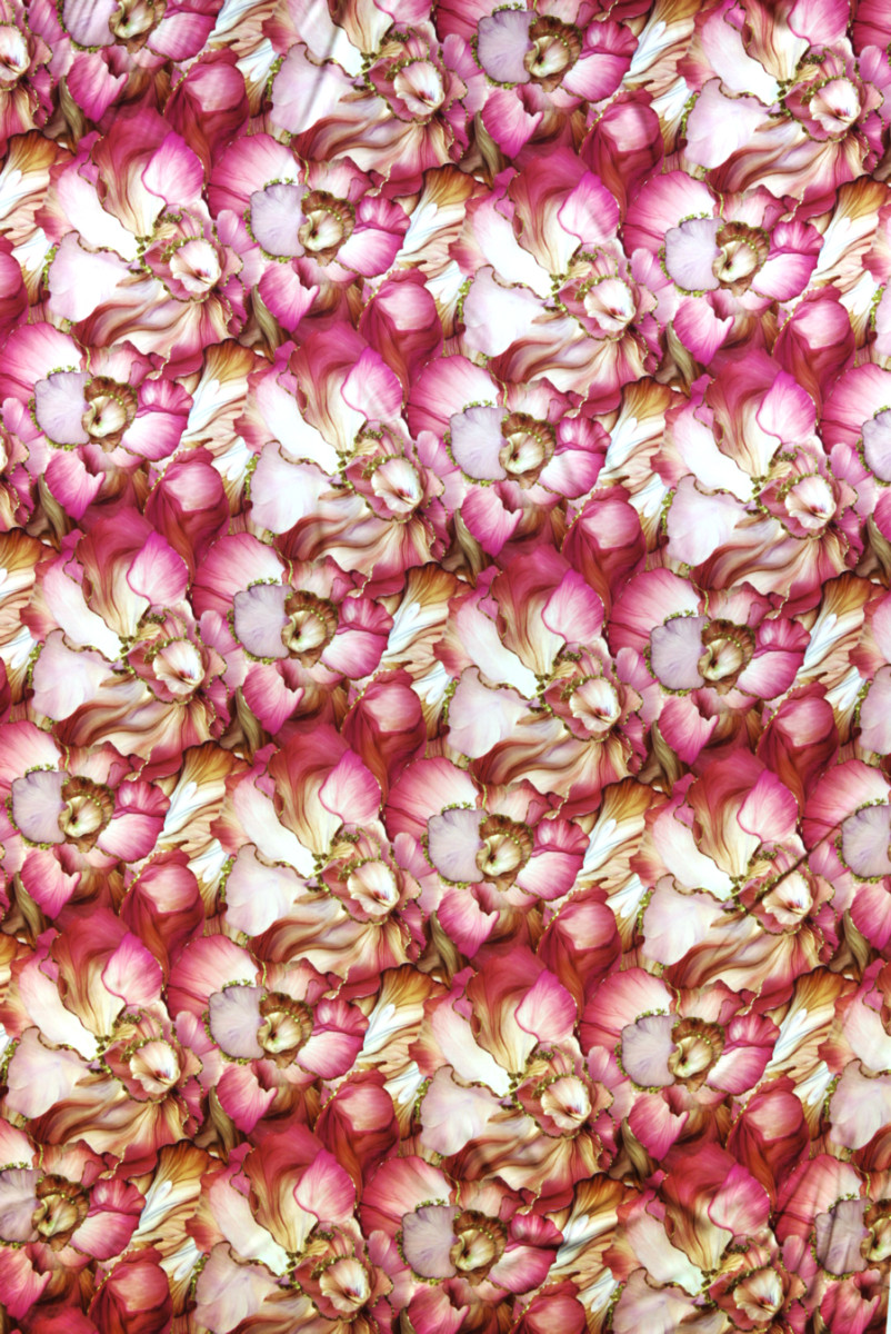 Itaalia siidsatiin, millele on lisatud elastaani, suurte värvitud lillede motiiviga koralli ja roosa toonis. Lilleline, tihe muster, kus osa õisi on viimistletud kuldse kontuuriga, tänu millele omandab kogu asi erksa ja ainulaadse välimuse. Kangas on voolav, elastne, läbipaistmatu ja pehme. Ettepanek, mida soovitame eriti õhuliste kleitide ja seelikute jaoks, sobib suurepäraselt ka pluuside ja särkide jaoks.