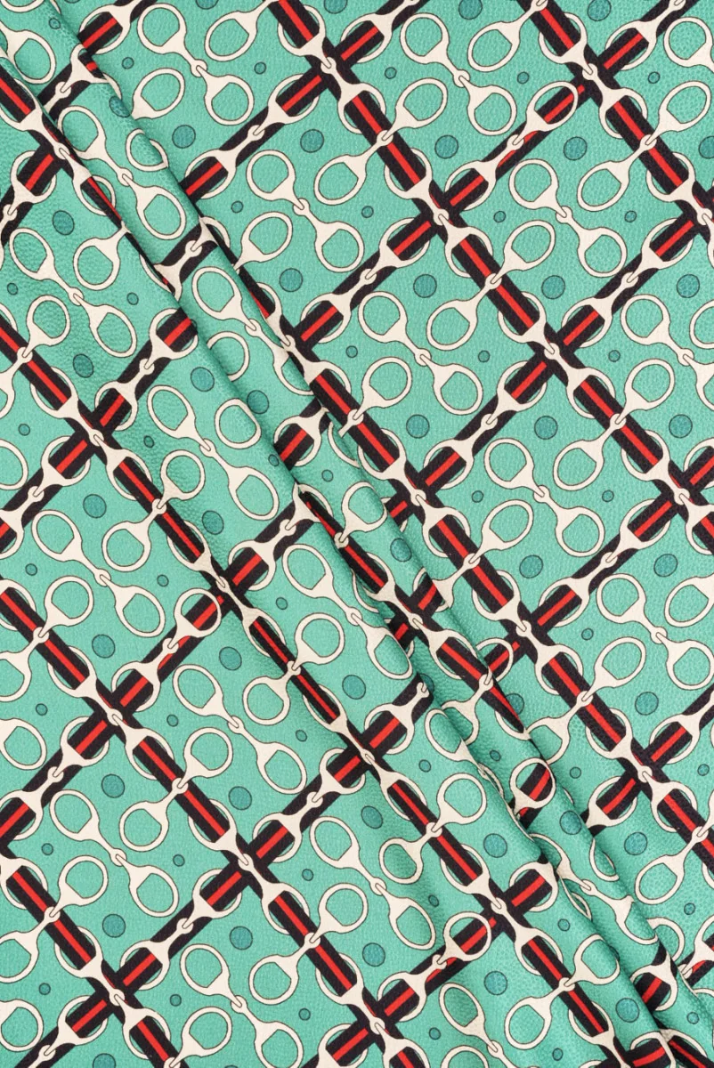 Itaalia siidkangas, millele on lisatud viskoosi segu žakaarkoega salvei värvi. Tavaline muster, millel on kujutatud põimunud musta ja punase triibuga pandlad, mis loovad 10 cm laiuse kaldus ruudu. Kangas on voolav, elastne, õhuke, kuid läbipaistmatu ja väga meeldiv haarduda. See sobib suurepäraselt pluusi, särgi, kleidi ja seeliku õmblemiseks.