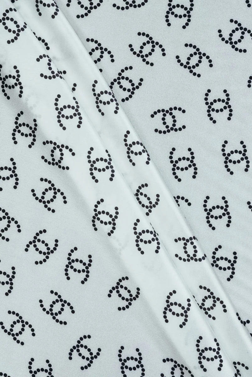 Itaalia siidisatiin elastaaniga, kreemjas värvitoonis mustade mustritega. Motiivi loovad ebakorrapäraselt paigutatud, täppidest koosnevad, tuntud moemaja logod, nende suurus on 3,5 cm. Kangas on õhuke, õrnalt läbipaistmatu, kerge, õhuline ja elastne. Huvitav pakkumine parima kvaliteediga kaubamärgiga kangaste austajatele. See sobib suurepäraselt kleitide, pluuside, särkide või kimonode jaoks.