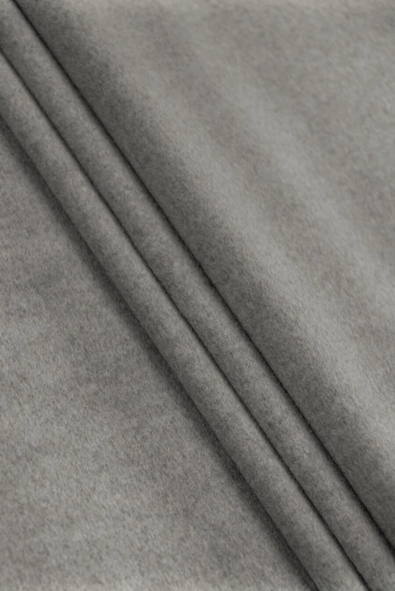 Itaalia kostüümikangas siidist ja puuvillast – kahepoolne. Ühelt poolt hallis melanges, teiselt poolt hallis – hõbedas. Materjal on keskmise paksusega, õrna harjasega, pehme ja meeldiv katsuda. See sobib ideaalselt sügis- ja talveriiete õmblemiseks, nagu seelik, jakk või õhuke jakk ja mantel. Suurepärane alternatiiv villastele kangastele.