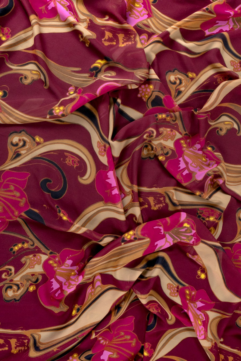 Siidist šifoon, mis on mustriline Burgundia taustal suured fuksiaõied roosade ja beežide mustade okstega. See on väga õrn, läbipaistev kangas (vajab vooderit). Ideaalne õhuliste kleitide, seelikute ja pluuside jaoks.