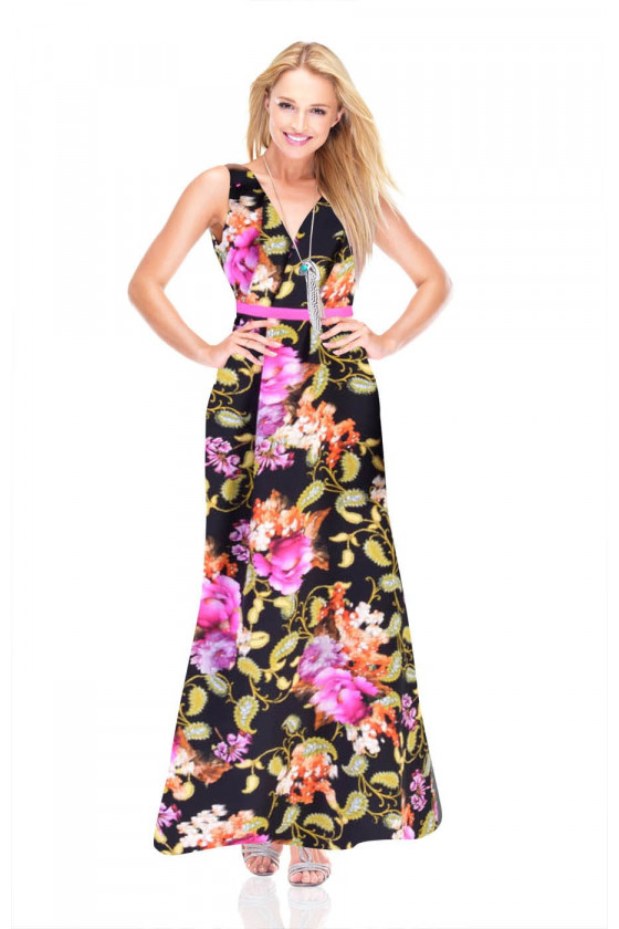 Itaalia 100% siidist cadi kangas mustas värviliste lillede motiiviga. Ilus kombinatsioon roosadest pojengiõitest ning väiksematest apelsini- ja kreemiõitest, tervikut täiendavad väiksemad, tihedad lehed. Muster on veidi hägune, mis muudab selle veidi kolmemõõtmeliseks. Kangal on tihe, sile kudumine ja õrn, üllas sära, mis on iseloomulik siidkangale. Ideaalne kangas kvaliteetsete looduslike kangaste fännidele, kellel on lillemustrid.
