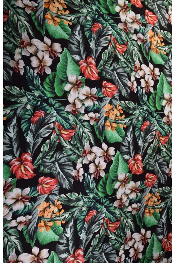 Siidist krepp elastaaniga on õrn kangas, katsudes sametine, poolläbipaistev. Džungliprint, saate välja võluda õhulised kleidid, õrnad pluusid, pareod. Soovitame kasutada voodrit.