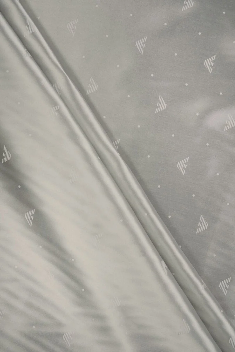 Itaalia jacquard vooder helehallis, millel on regulaarne motiiv väikeste templite ja täppidega. See muster esineb regulaarselt ning ühe graafilise elemendi suurus on 2cm*1cm. Kangas on elastne, veidi läikiv ja tuntud moebrändi allkirjaga. Ideaalne mantlite, jopede, vestide ja jopede voodriks.