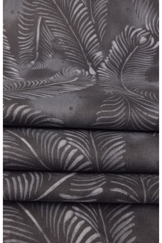Elastne denim, kootud viskoosniitidest -94% ja elastaan 6%. Värvid - heledad lehed tumehalli taustal. Tänu oma elastsusele sobib kangas tihedalt liibuvate riiete õmblemiseks.