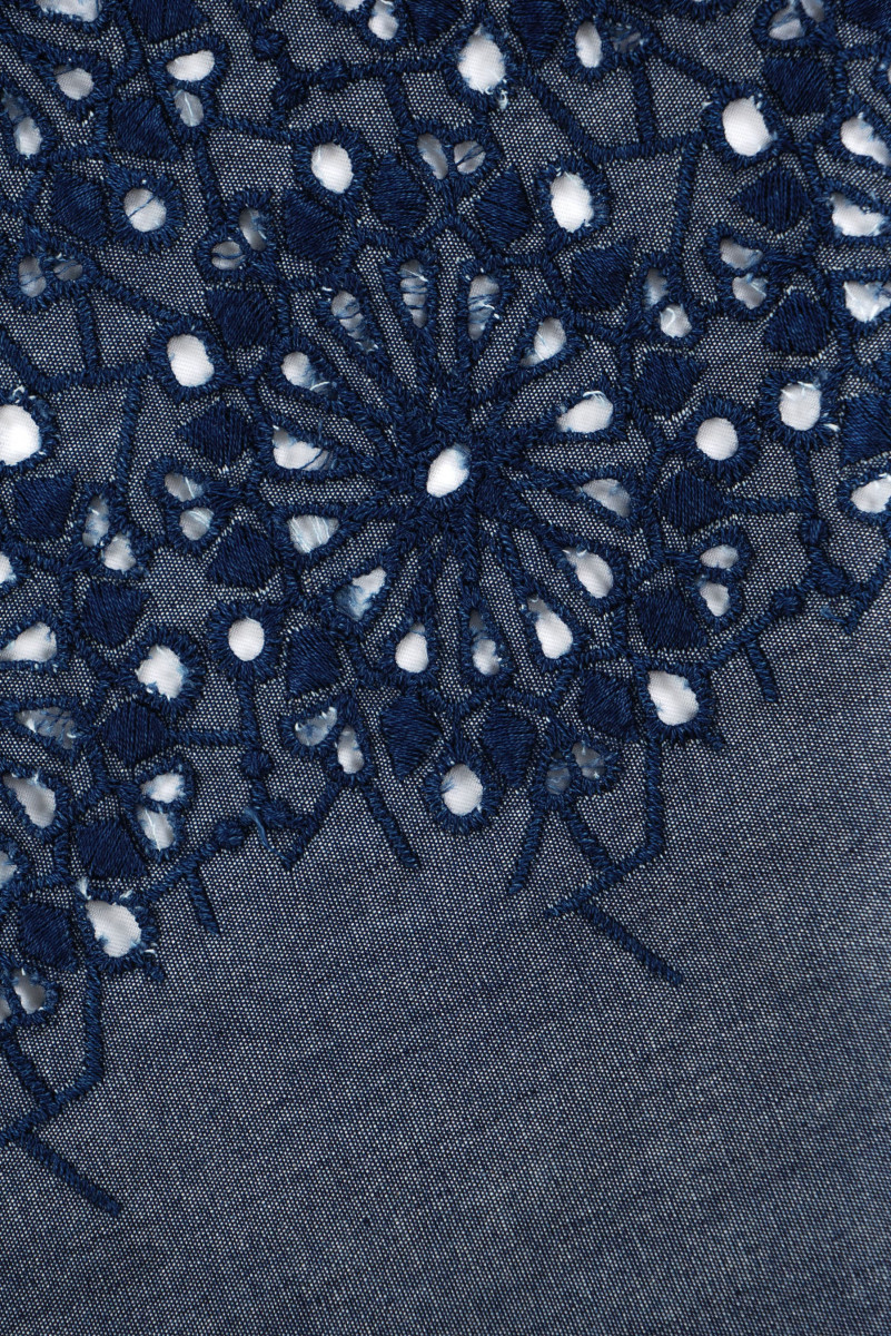 Itaalia puuvillane kangas, mis meenutab õhukesi teksaseid hallis ja tumesinist tumesinist tikandit. Kangas on 155 cm lai ja tikand ise 135 cm. Kergelt jäik kangas, mis vajab vooderit - ideaalne kleidi, pluusi, seeliku õmblemiseks.
