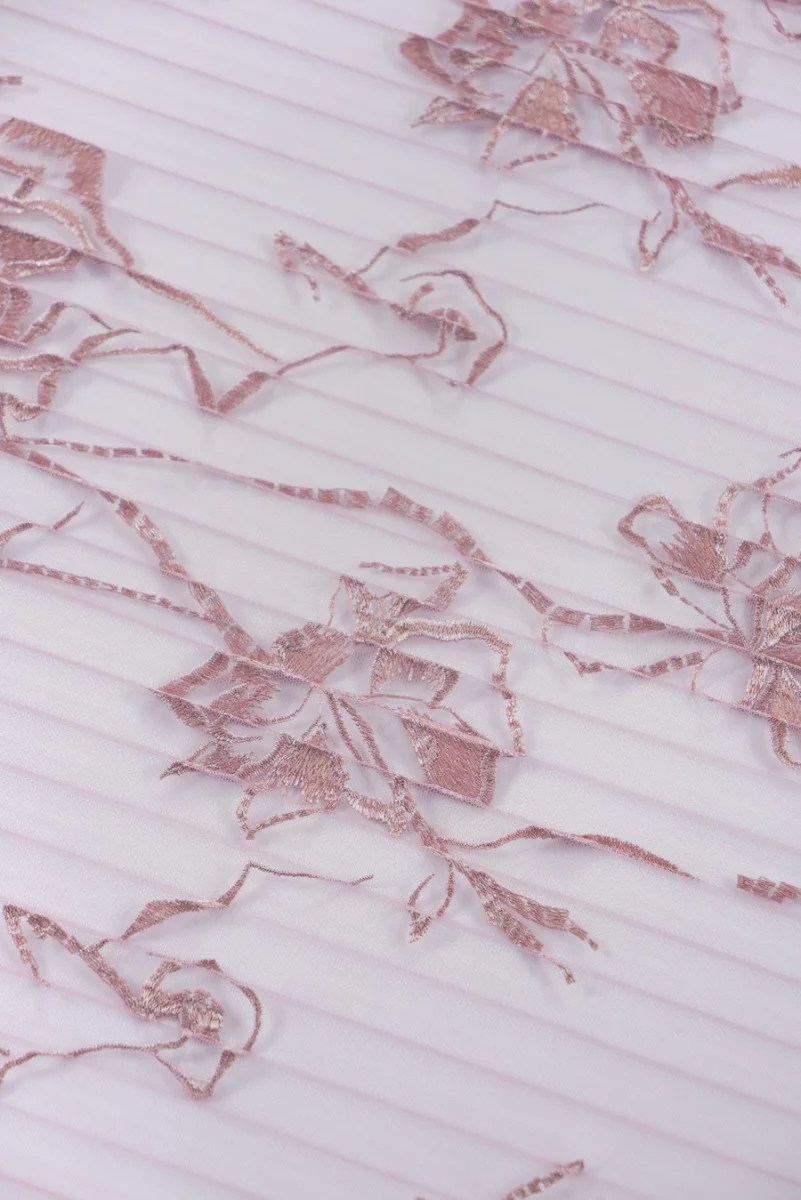 Itaalia plisseeritud tüll tikitud lilledega määrdunud roosas. Plisseeritud ruloo laius on 1,5 cm. Kangas õmmeldakse ringikujuliselt. Ideaalne seeliku või kleidi õmblemiseks.