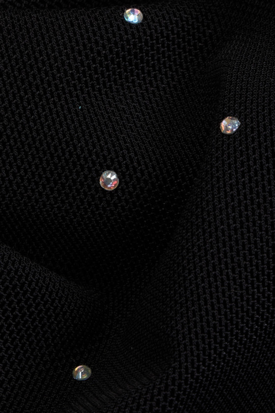 Itaalia elastne võrk mõlemas suunas musta värviga, liimitud mitmevärvilise tsirkooniumoksiidiga. Õhuke, läbipaistev, pehme, elastne kangas - sobib suurepäraselt õhtupluusi, kleidi, seeliku õmblemiseks või viimistlemiseks.