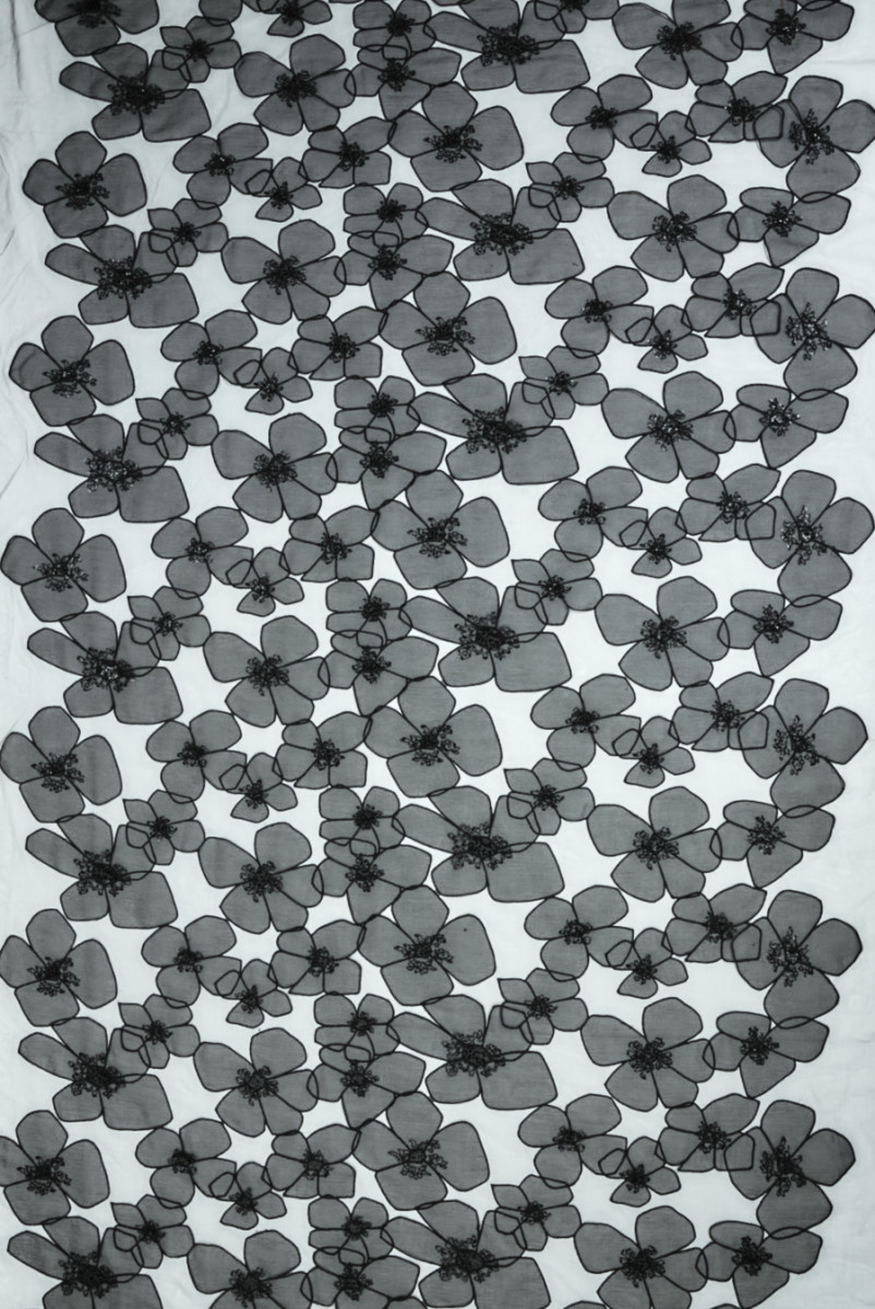 Itaalia tüll klassikaliste mustade aasadega, millel on kergelt lainelisest organzast valmistatud suurte mustade lillede motiiv. Suuremad õied on 20 cm * 23 cm, väiksemad 10 cm * 14 cm. Muster on tihedalt laotud 135 cm laiusele, kogu tüll on 160 cm lai. Lilled kattuvad üksteisega ja nende keskosad on kaunistatud väikeste mustade litritega. Materjal on läbipaistev, painduv, kergelt jäik ja õied ise on väga õrna läikega. Originaalne kangas, millest saab luua kleite, seelikuid, pluuse.