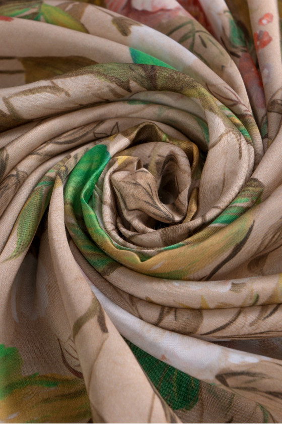 Itaalia viskooskangas väga hea kvaliteediga. Lillemotiiv beežil taustal. Mitteelastne, paksem, pehme, satiinkangas. Ideaalne pluusi, kleidi, seeliku õmblemiseks. Värvid: beež, roheline, valge, khaki, oranž, pruun.