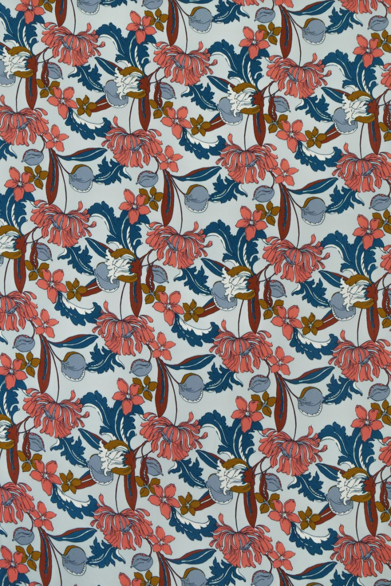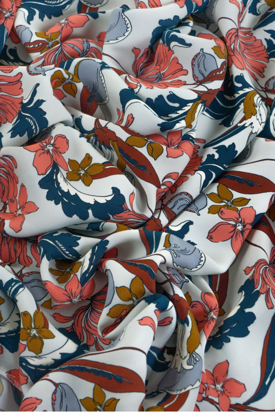 Itaalia kangas 100% cadi viskoos. Värviliste lillede motiiv määrdunud piparmündi taustal. Raske, voolav, mitteelastne kangas - ideaalne kleidi, pluusi, seeliku õmblemiseks.