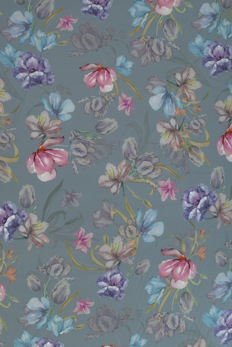 Itaalia 100% viskooskangas hallikassinine, värvitud lillede motiiviga sinine, lilla ja roosa. Viskoos on tselluloosist saadud kangas, väga hingav ja pehme, see on nahasõbralik (mitteallergiline) ja imab niiskust suurepäraselt. Mitteelastne, läbipaistmatu kangas - ideaalne suvekleidi, pluusi või seeliku õmblemiseks.