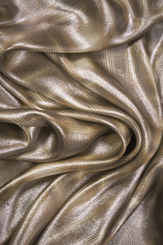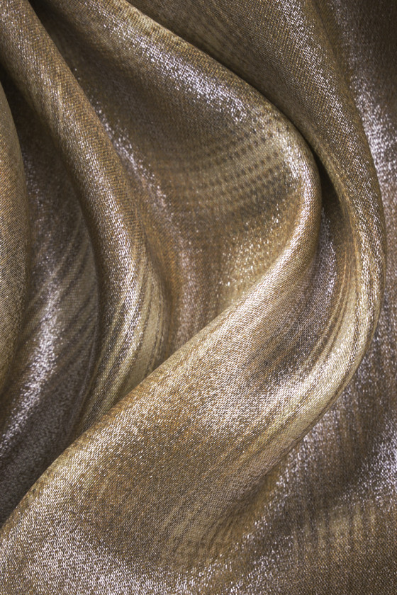 Itaalia viskooskangas, millel on beežis ja pruunis fuzzy kontrollmotiiv, kaunistatud kuldse lurex-niidiga, mis loob säraefekti. Viskoos on tselluloosist saadud kangas, väga hingav ja pehme, see on nahasõbralik (mitteallergiline) ja imab niiskust suurepäraselt.