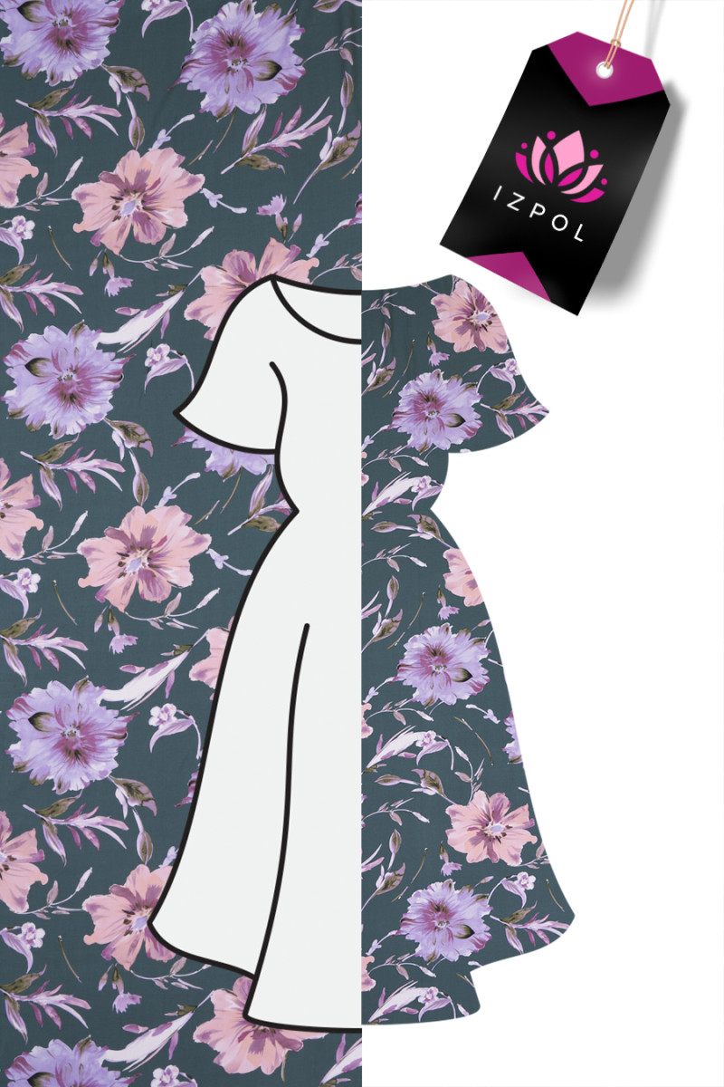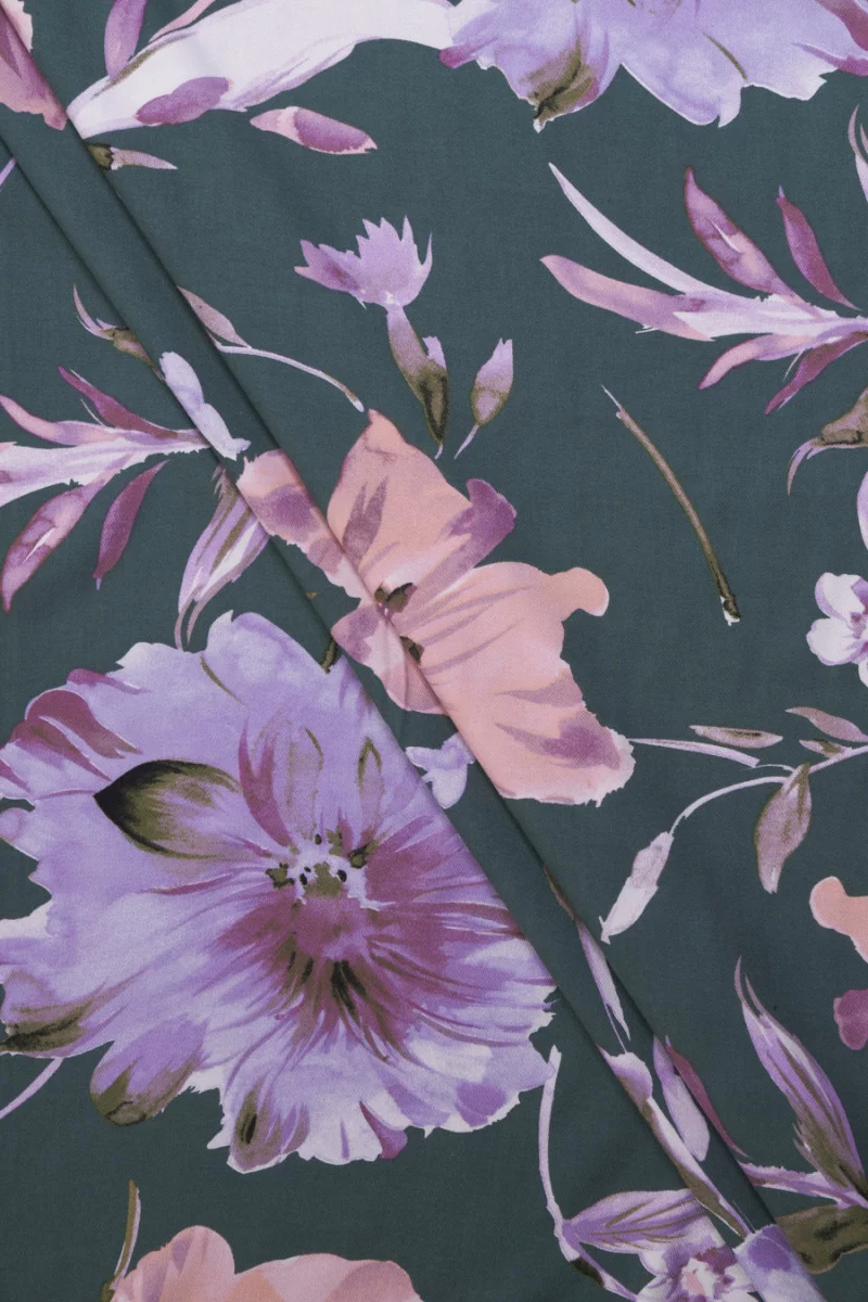 Itaalia 100% viskooskangas tumedas, summutatud rohelises, suurte lillede motiiviga (u 25 cm) kanarbiku- ja lõhevärvis, lilledel on lilla ja roheline täidis, see töötlus muutis mustri mitte tasaseks ja väljendusrikkamaks. Lillemotiivid ümbritsevad väiksemaid lehti ja oksi, mis muutsid selle tihedaks. Kangal on õrn twill kudumine, see on elastne, väga pehme ja meeldiv puudutada. Ilus ettepanek inimestele, kellele meeldivad lillemustrid peentes, summutatud värvides.
