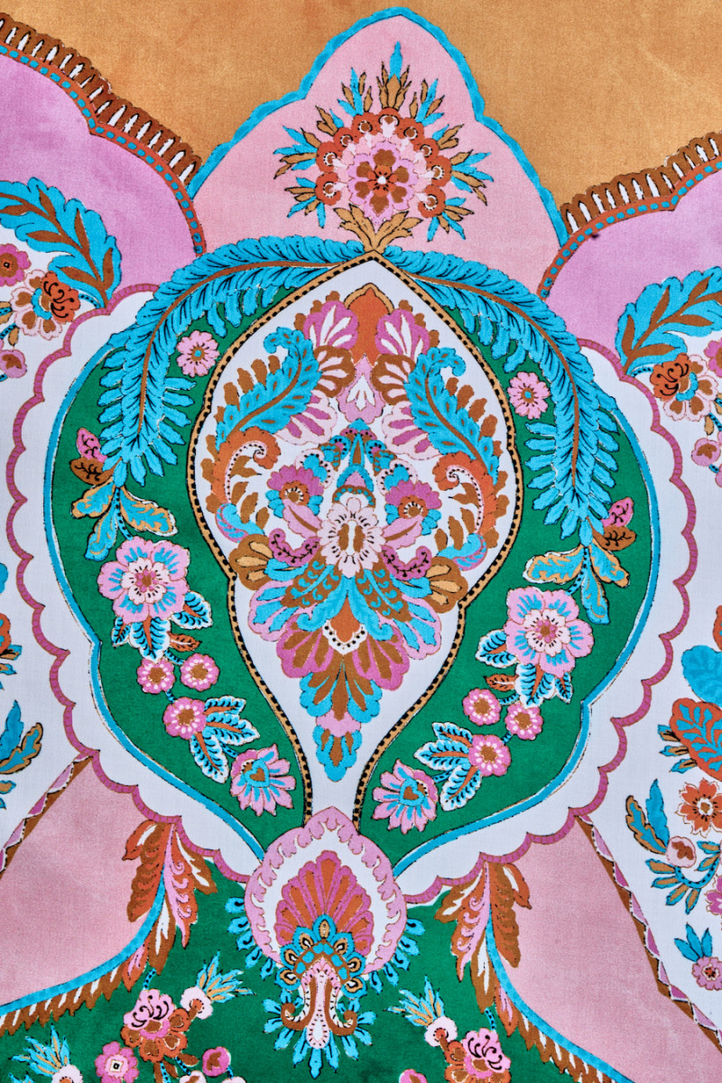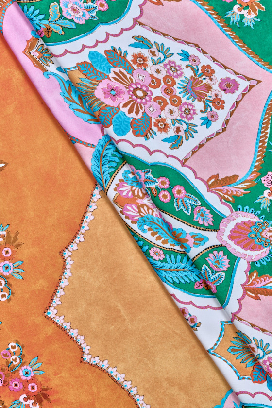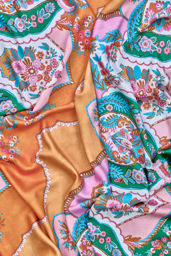 Itaalia kangas 100% viskoos idamaiste motiividega oranžis, roosas, rohelises ja türkiissinises. Kangas on kerge, voolav, mitteelastne ja väga meeldiv puudutada. Kangas õmmeldakse ringikujuliselt. Värvikas ettepanek suvekleitidele, seelikutele, pluusidele.