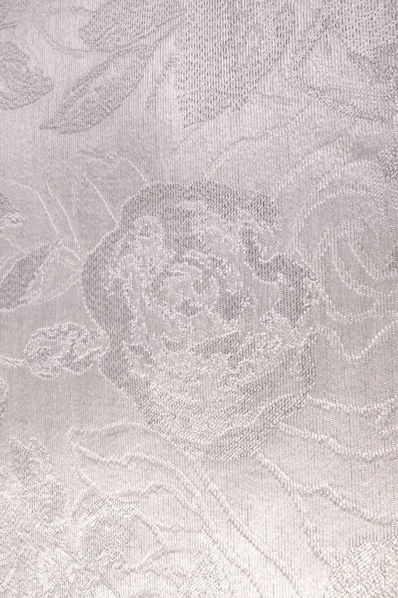 Elegantne jacquard valge hõbedase lurex niidiga. Kangas särab kaunilt valguses ja sobib suurepäraselt pulma- ja pidulike kleitide, seelikute, jakkide õmblemiseks.